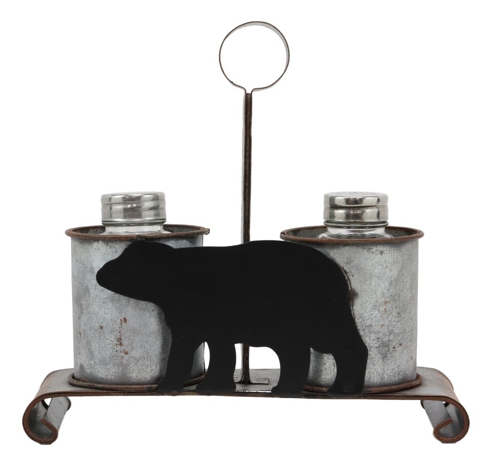 ? Decorating your kitchen and dining table with a rustic western ranch style will never be easier with this galvanized metal bear themed salt and pepper shakers holder/carrier. Featuring a distressed aged metal medium with rust spots painting, this hand crafted sculpture brings out the Old World, old fashioned vintage farm and country vibe. Store your glass shakers in the two slots and use the handle to move the carrier around your house safely!