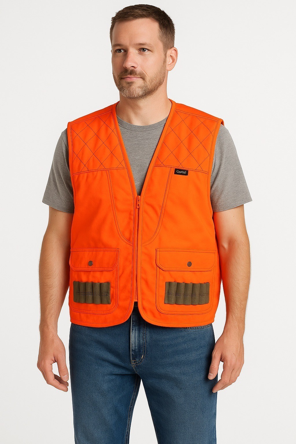 Classic blaze orange Gamehide vest designed for visibility and comfort in outdoor environments. This durable polyester vest features quilted shoulder panels, large storage pockets, and elastic loops for easy access to small gear or accessories. A great piece for fieldwork, hiking, or vintage outdoorwear collections.