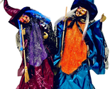 Ganz Vintage 1990's Set Of 2 Fiber Optic Glowing Hair Cackling Sounds Light Up Eyes Large 22" Rare Halloween Sister Witches With Brooms. One is dressed In blue satin with a black sheer gold lame cats, jackolanterns, withches bats cape the other is in a purple satin dress with sheer black sliver images cape. They each come with an umbrella stand. Very Good Overall Working Condition, the purple one has original hang tag, some corrison in the battery case on purple withch but optics, lights and sounds work well, the blue one has a clean battery pack, sounds lights work well but optics are faint.The original tag describe them as being able to sway shake but I could not get them to do it. Same or next business day USPS Shipping.