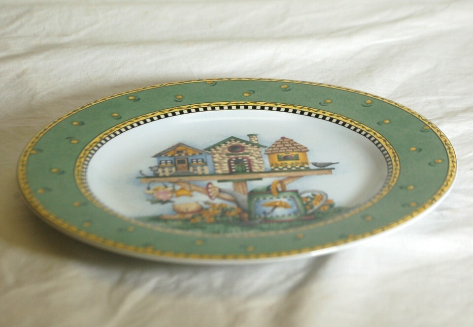 Garden Vignette Sakura Salad Plate Multi Motif Gardening Scenes Birdhouses