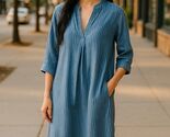 - Garnet Hill Womens Blue & White Striped 100% Linen Tunic Dress V-Neck 3/4 Sleeve