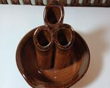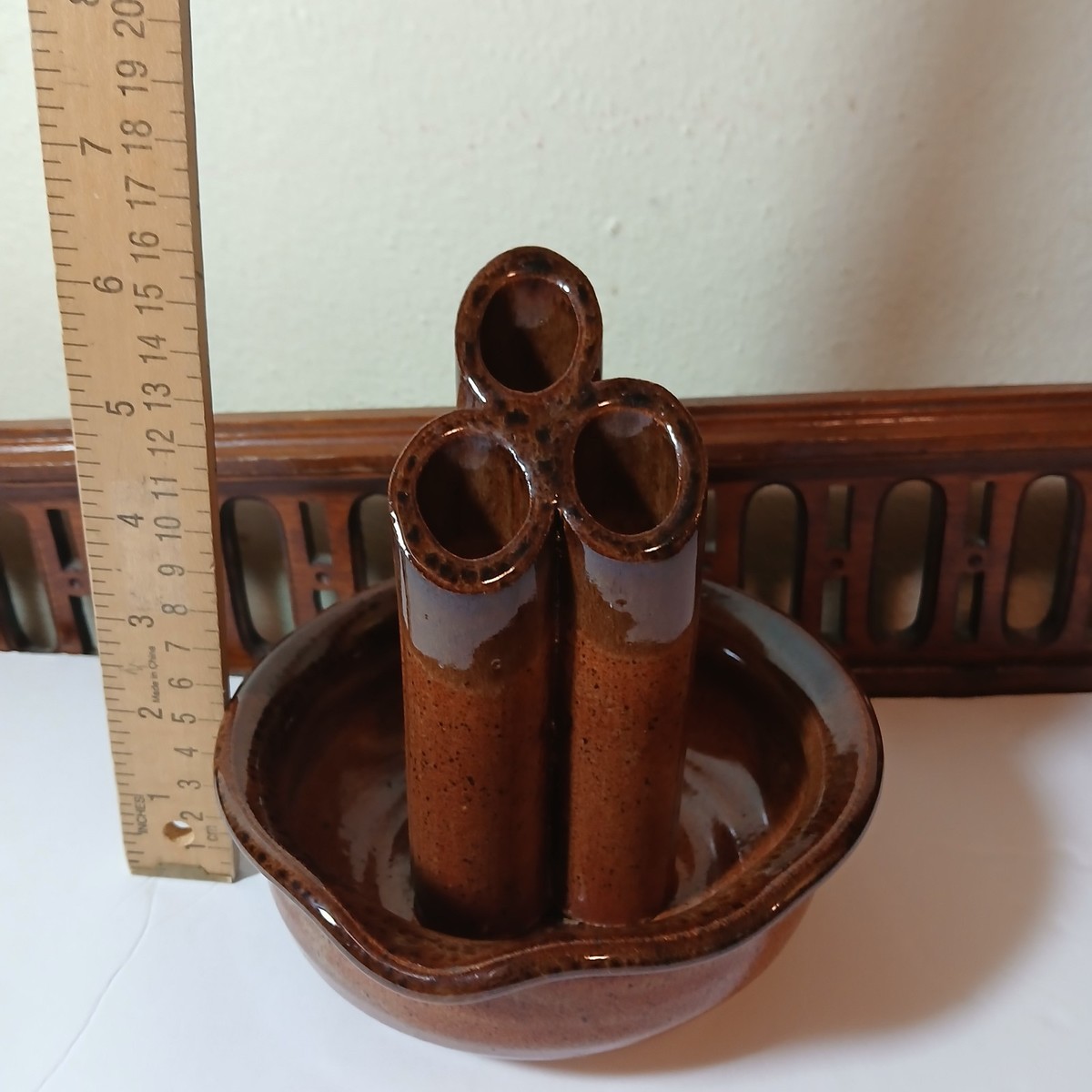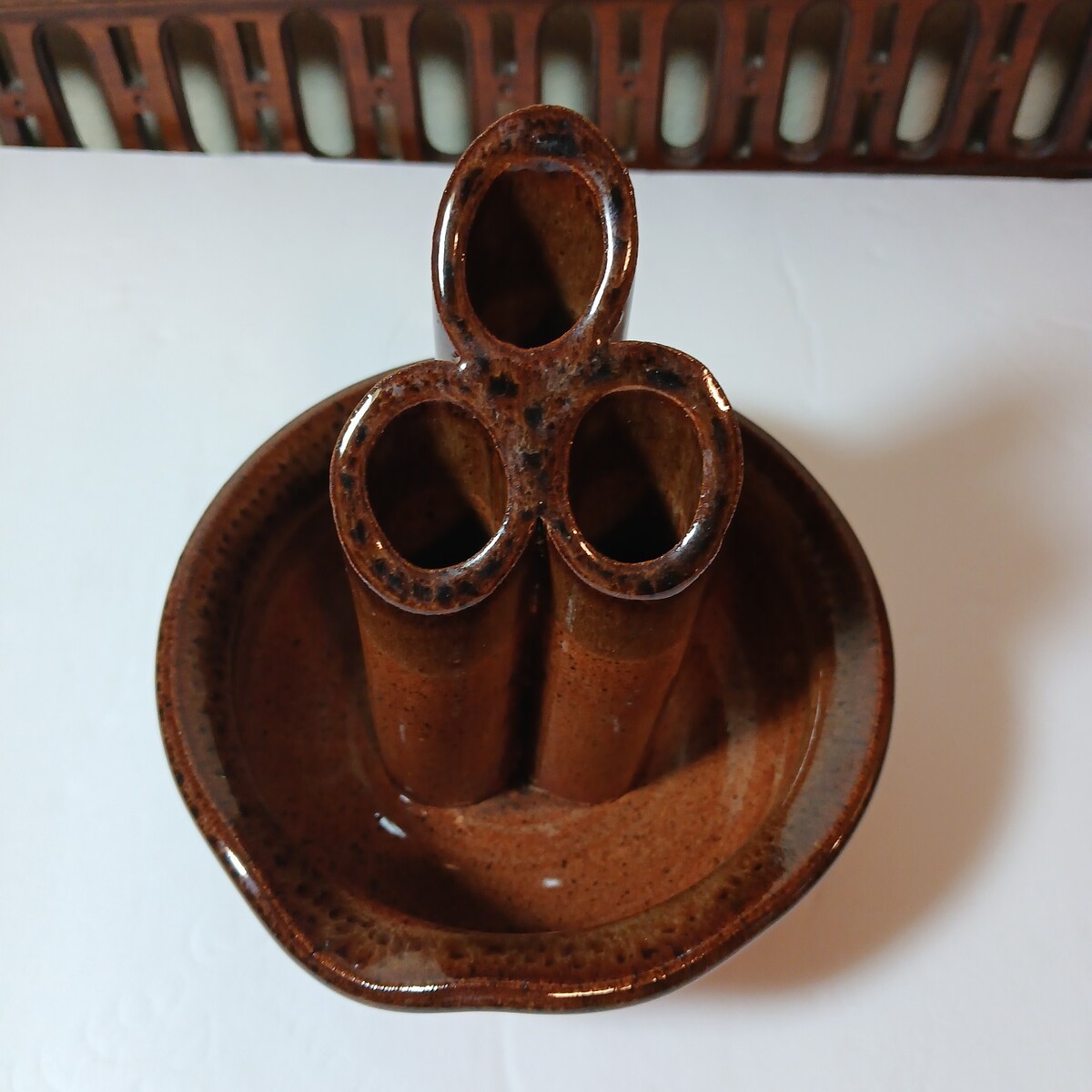 Beautiful Garnett Studio Pottery stoneware ikebana vase, handmade in Lancaster, Pennsylvania. This closed pottery studio is known for its earthy glazes and functional artisan forms. The piece features a sculptural triple-tube flower arranger rising from a hand-thrown bowl, designed for holding stems upright while the bowl collects water.