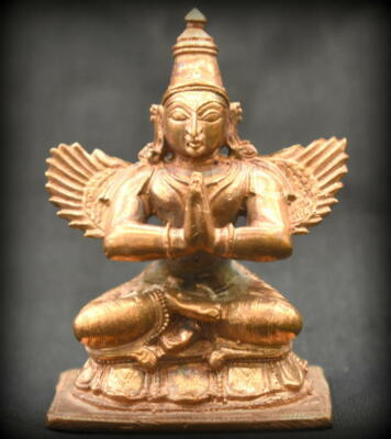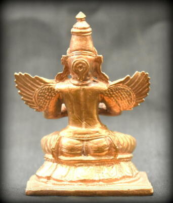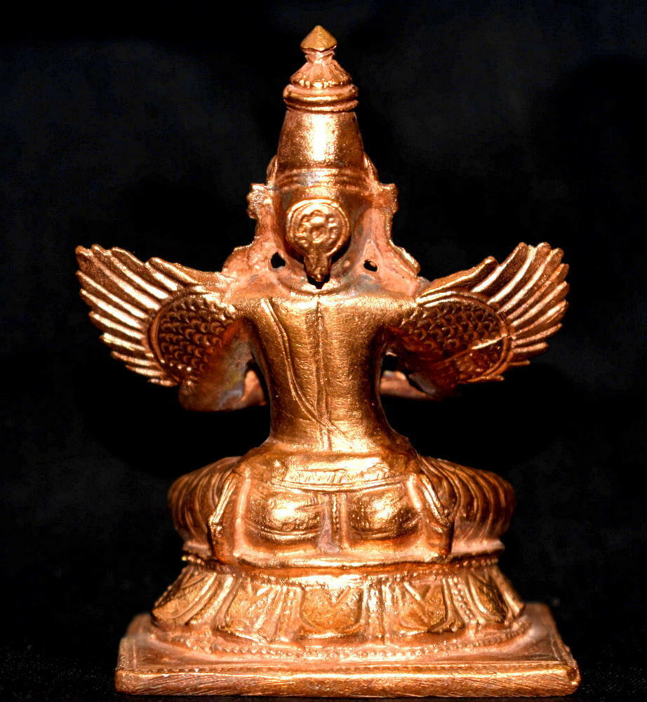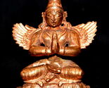 In this beautiful carved sculpture in solid copper by south indian artisians ,Garuda is sitting with his hands clasp together in the Anjali Mudra or Namaste position in front of his chest of greeting and respect probably directed at his Lord Vishnu. His beautiful sharp wings are spread wide. The out stretched wings make this piece truly an inspiring piece. The details on the wing and the entire piece are abundant . The beautiful illustration of clothing and ornaments enriched with brilliant radiance add to the exquisiteness of the Idol.