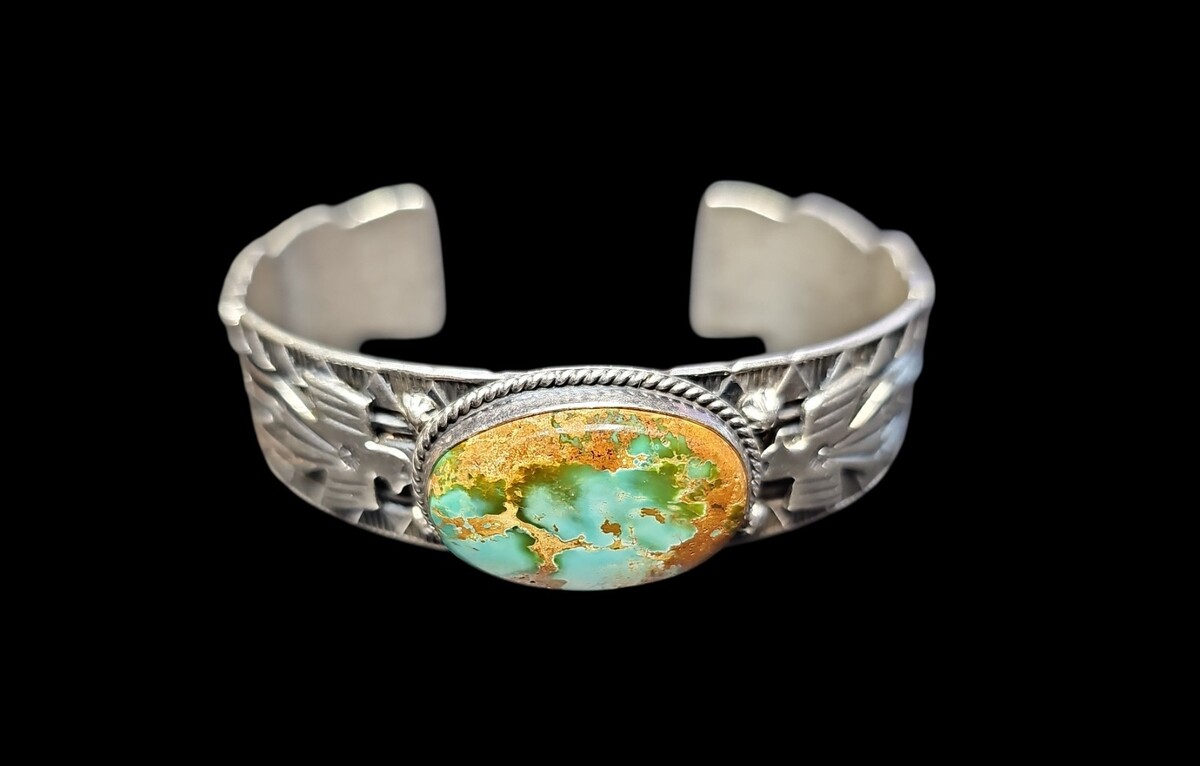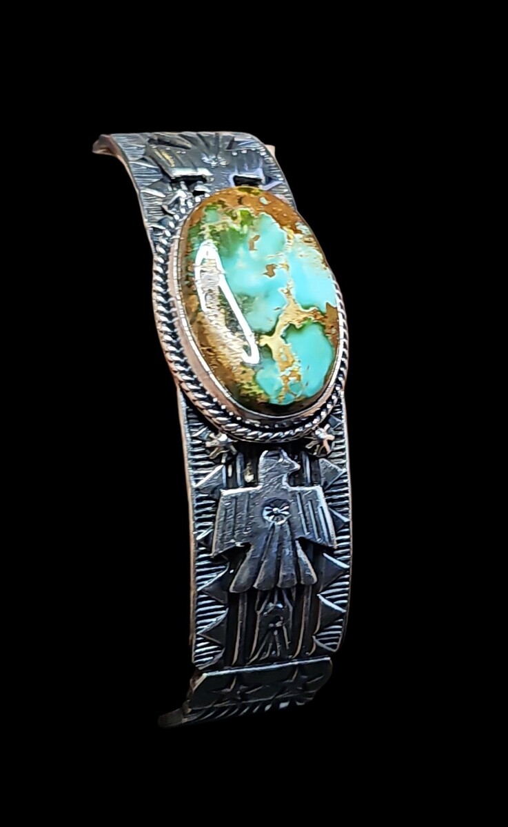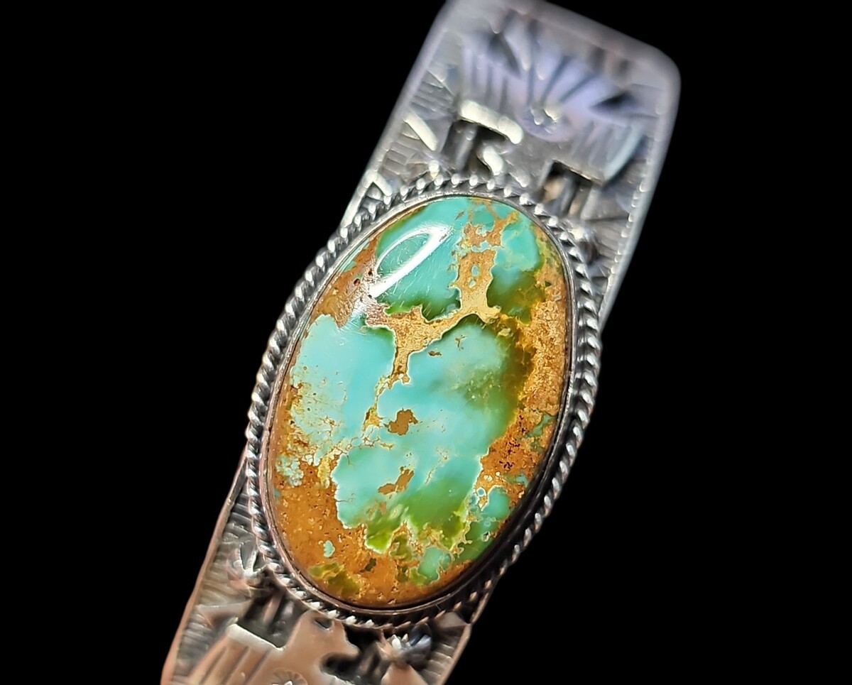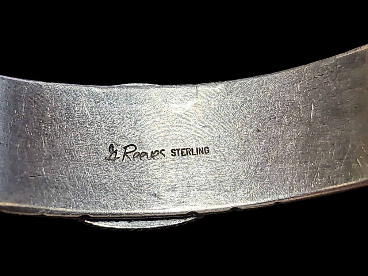 This vintage Navajo sterling silver cuff is signed G. Reeves for master silversmith Gary Reeves. The bracelet features a large natural Royston turquoise cabochon set in a handmade rope bezel. The band is decorated with deep traditional Navajo stampwork, including thunderbird and star designs, all applied in Reeves? distinctive bold style. The cuff is solid and substantial, weighing 1.676 ounces / 47.51g, and has the strong craftsmanship and balanced design Gary Reeves is known for. A highly collectible signed Navajo turquoise cuff with exceptional stone and detail.
