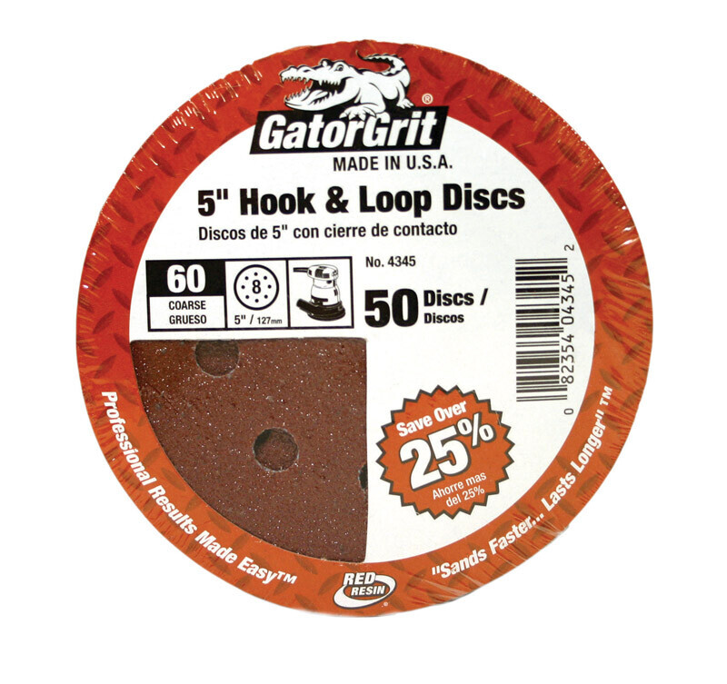 Gator 4345 5" Random Orbit Hook Loop Red Resin Aluminum Oxide Sanding Discs, 60 Grit, 50 Count