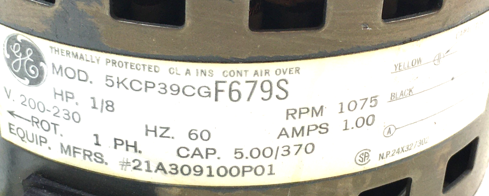 This is GE 5KCP39CGF679S Condenser MOTOR 1/8 HP 200/230V 1075 RPM 21A309100P01 used part.