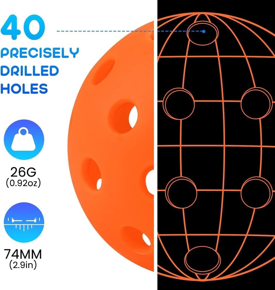 Precise Design for Optimal Play: Geekman's high visibility orange pickleballs measure a precise 74mm in diameter and weigh 26g, meeting all USAPA regulations. This accurate sizing and weight distribution allows for consistent, dependable play at any skill level. The eye-catching orange color further enhances on-court visibility, whether serving or volleying returns.