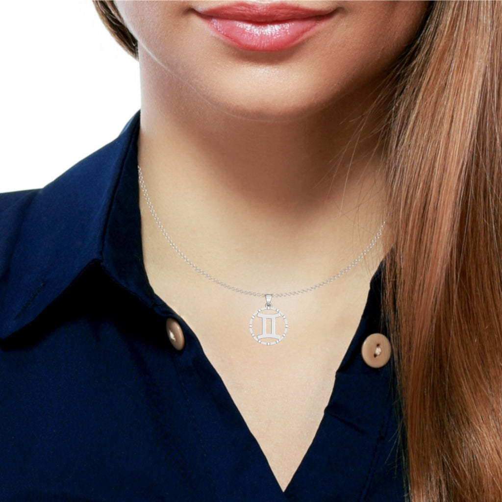 - Gemini Zodiac Sign Diamond Bezel Pendant In Solid 10K White Gold