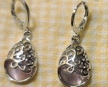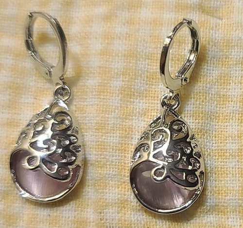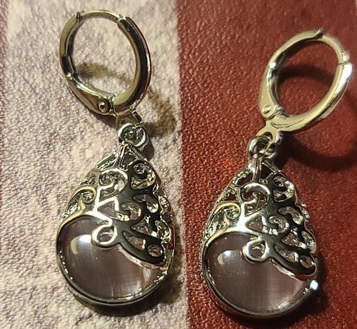 Silver hardware holding a gemstone that appears as a light purple in some lighting a light smoke gray in other lighting.