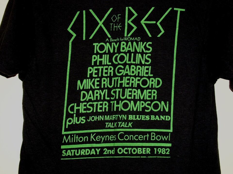 This is a very scarce, vintage concert tour t shirt entitled, "Six Of The Best, A Benefit For Womad Tony Banks, Phil Collins, Peter Gabriel, Mike Rutherford, Daryl Stuermer, Chester Thompson plus John Martyn Blues Band and Talk Talk, Milton Keynes Concert Bowl, Saturday 2nd October 1982". Tag reads: Mayo Spruce Made in U.S.A. Shirt is single-stitched to establish its vintage. A terrific item for the fan or collector.