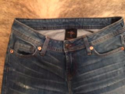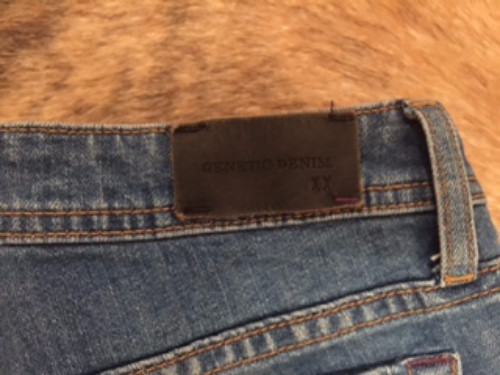 These pre-owned GENETIC medium blue wash flared denim jeans are in excellent pre-owned condition with no signs of damage of any kind. They feature: