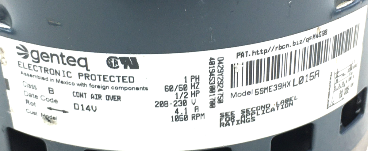 This is Genteq X13 FM19 5SME39HXL015A Blower Motor Lennox p/n 46132-060 208/230V .5HP 600/1200 RPM CCW LE rotation used part.