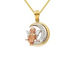 - Genuine 14k Tri-Tone Gold 0.70" CZ Angel and Moon Pendant Necklace 16" to 24"