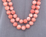 Genuine natural coral bead double strand necklace with 14k yellow gold clasp. The large round coral beads are slightly graduated in size from 8.3mm to about 7mm. The beads are salmon peach color with lighter areas. Freshly knotted.