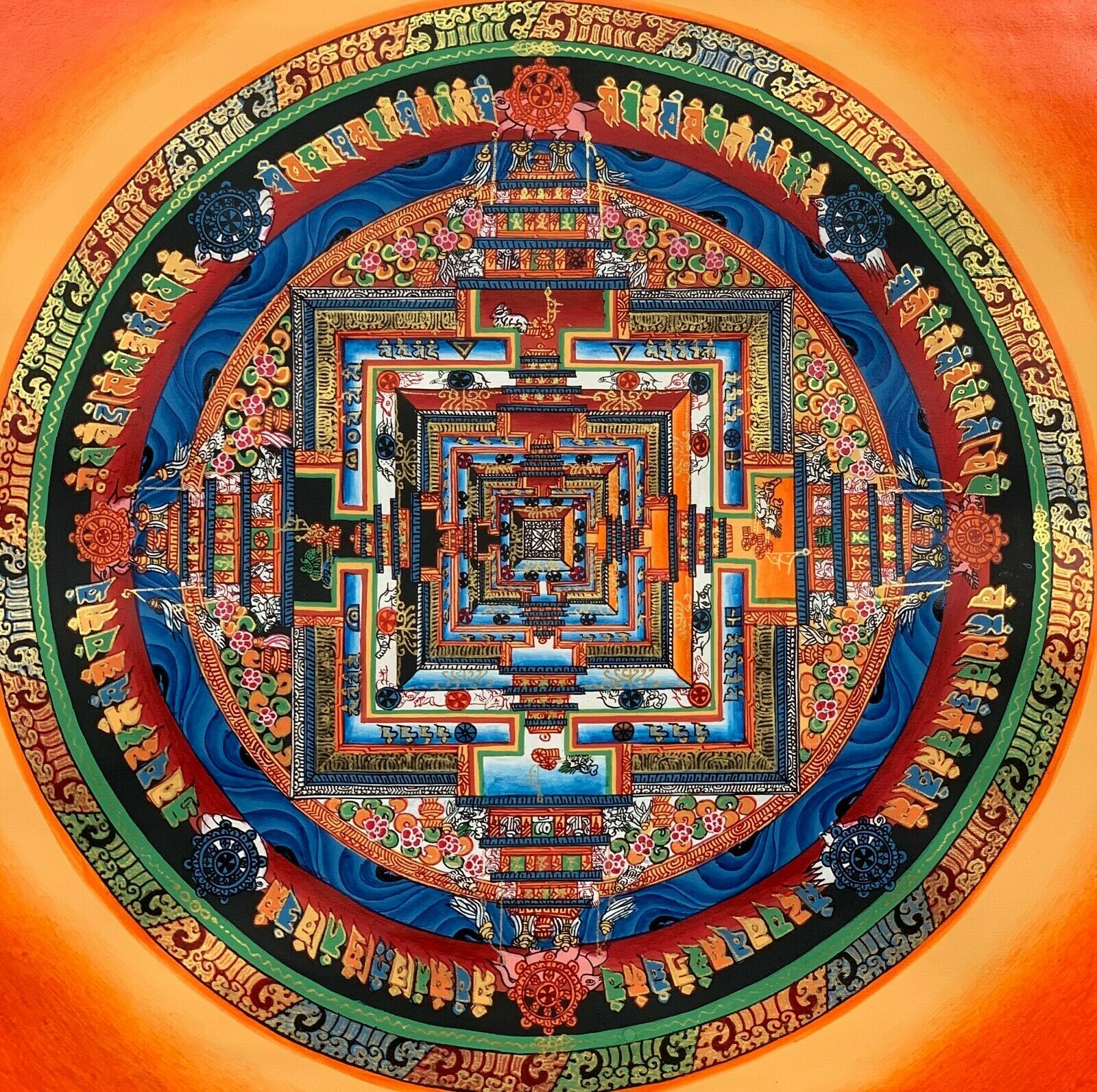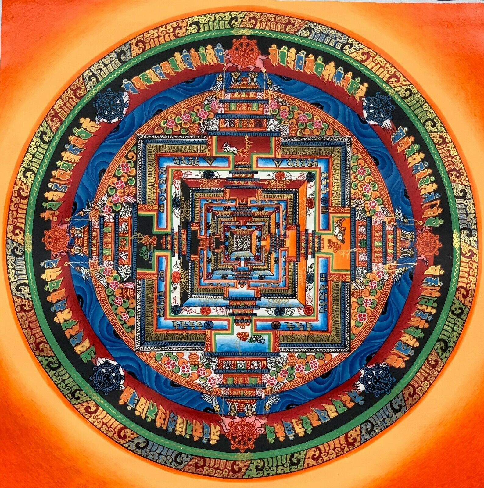 GENUINE HAND-PAINTED KALACHAKRA MANDALA -THE WHEEL OF LIFE CIRCLE ORIGINAL- UNIQUE TIBETAN THANGKA PAINTING, BUDDHIST ART