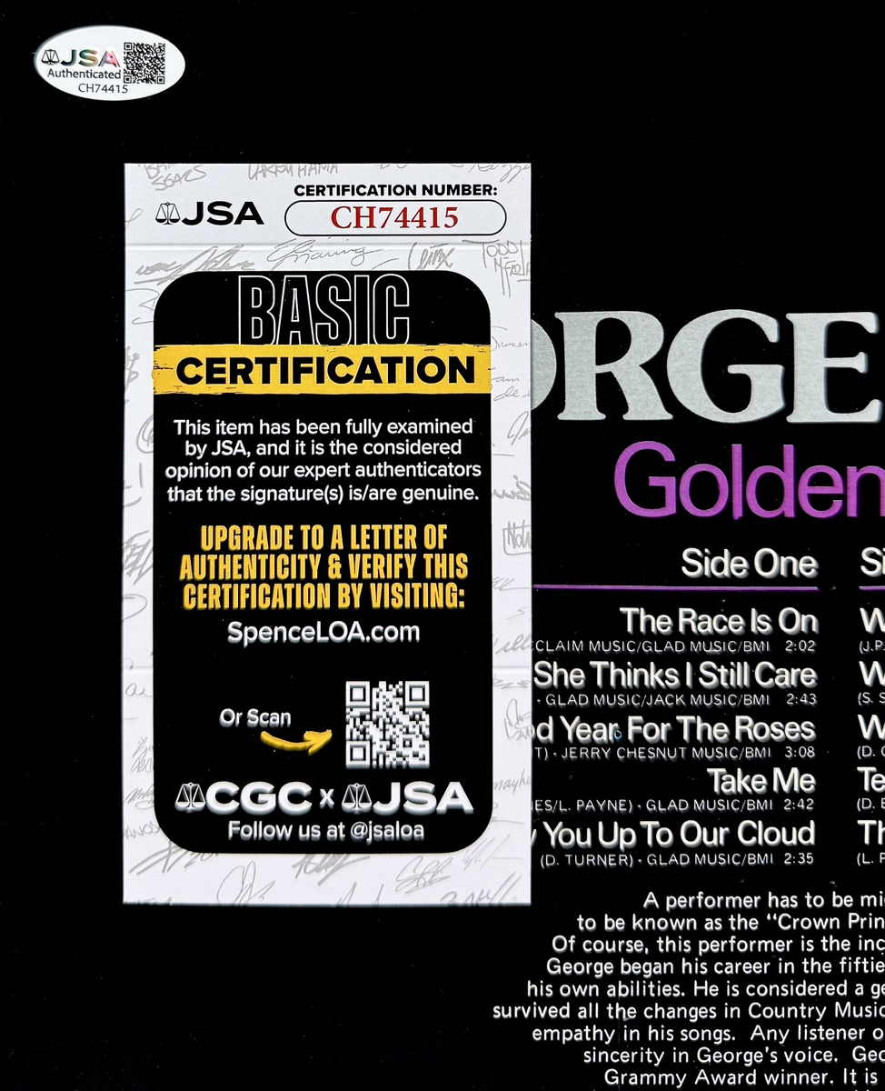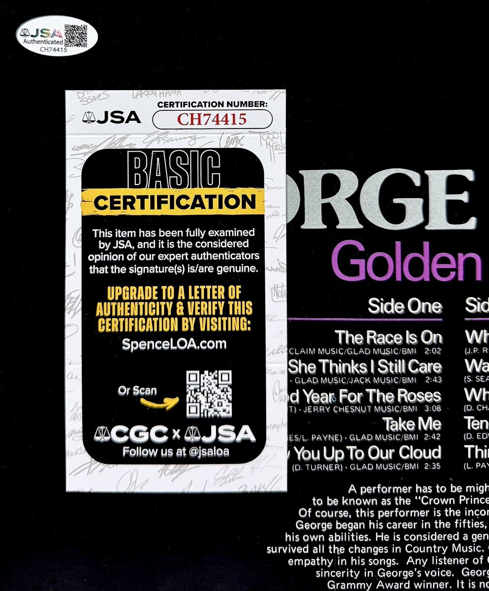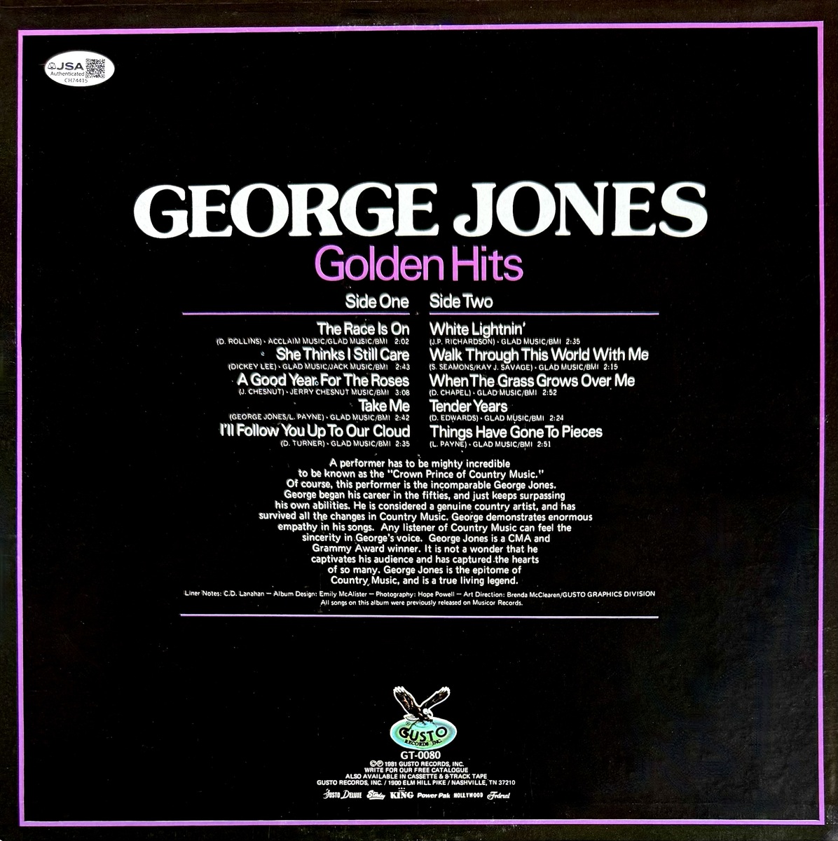 George Jones (September 12, 1931 - April 26, 2013) autographed 1981 Golden Hits vinyl record album cover signed in black felt tip marker. The vinyl record is included in very good condition. This signature has been authenticated by JSA James Spence authentication Certification Number: CH74415 and will come with the cert card you see in the scans. Songs include on side one The Race Is On, She Thinks I Still Care, A Good Year For The Roses, Take Me, and I'll Follow You Up To Our Cloud. Side two includes White Lightnin', Walk Through This World With Me, When The Grass Grows Over Me, Tender Years, and Things Have Gone To Pieces. He was an American country musician, singer, and songwriter. He achieved international fame for a long list of hit records, and is well known for his distinctive voice and phrasing. For the last two decades of his life, Jones is frequently referred to as "the greatest country singer", "The Rolls-Royce of Country Music", and had more than 160 chart singles to his name from 1955 until his death in 2013. In 2023, Rolling Stone ranked Jones at No. 24 on their list of the 200 Greatest Singers of All Time. He was inducted into the Country Music Hall of Fame in 1992. Buy with confidence we have been selling autographs since 1992.
