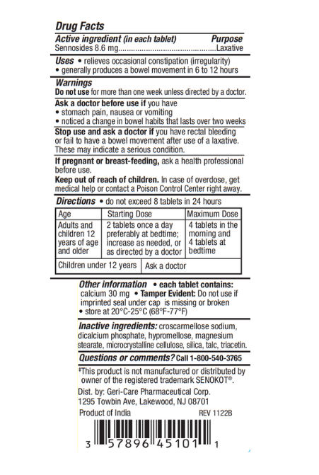 - GeriCare SENNA 8.6 MG TAB 100CT. Compare to Senokot Gentle Overnight Relief.