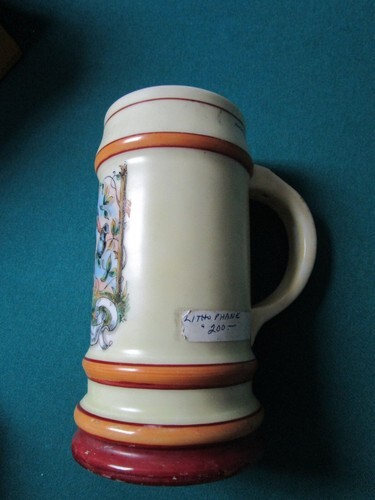 GERMAN ANTIQUE LITHOPHANE STEIN NO COVER 6 1/2" "AS LIFE SUNSHINE DRINK AND HAPPY" [MORE OR LESS]
