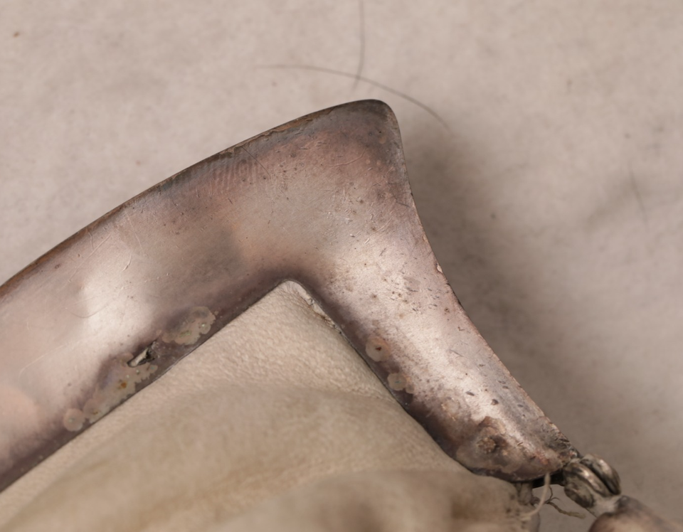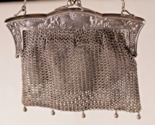 framework with mesh bag. Marked Ger Silver, W.H.S. CO. GOOD VINTAGE CONDITION. SELLING AS IS- NO REFUNDS. Silver Leather needs to be cleaned. One chain link is not attached to the outside side clasp, there are some perforated holes in the leather lining as pictured.