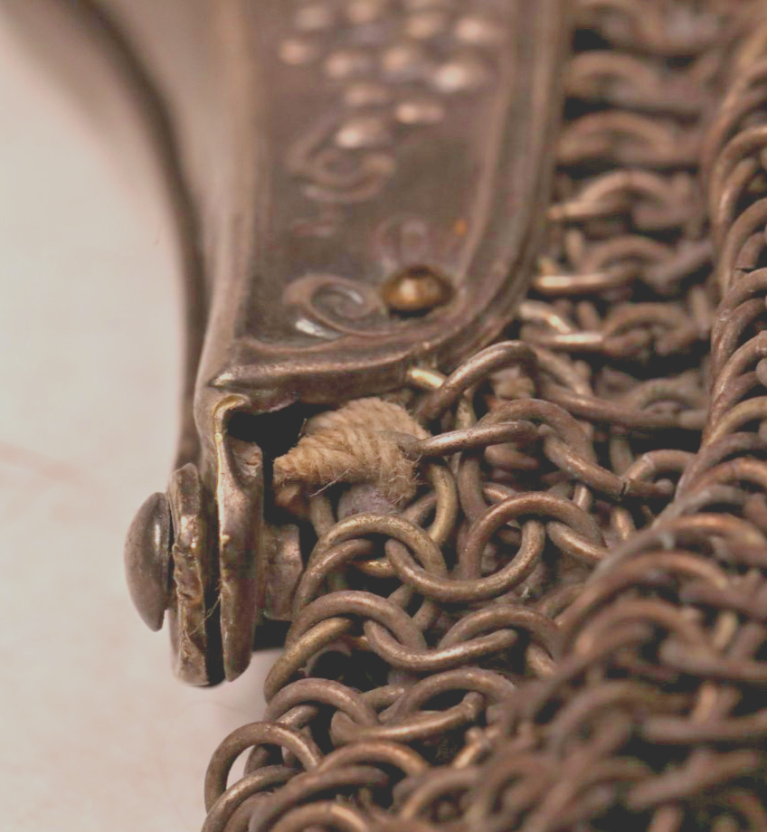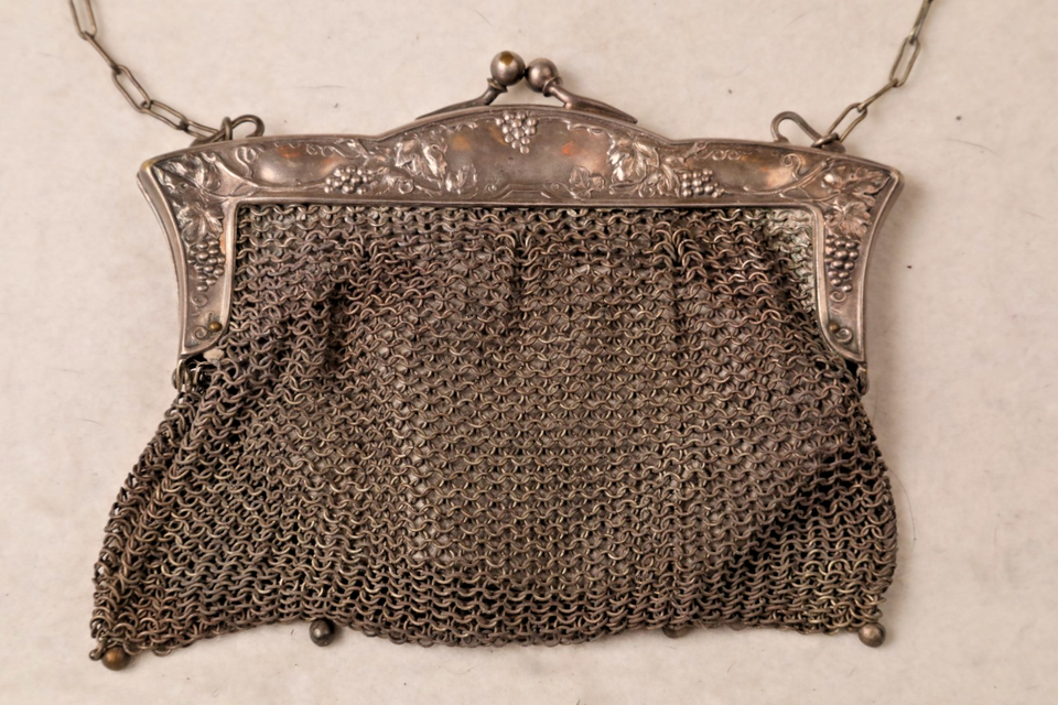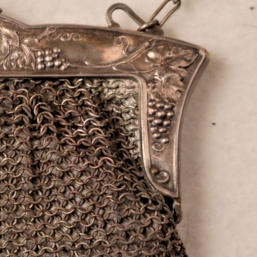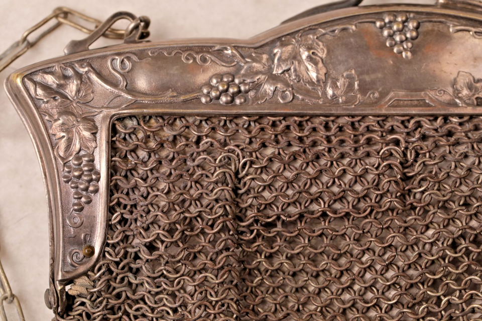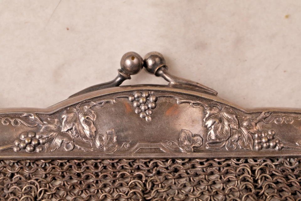 silver mesh evening bag. Engraved /stamp grapes grapevine design