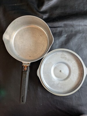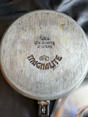 Le couvercle de casserole a double bec verseur GHC Magnalite de 2,5 litres de 2,5 litres est une batterie de cuisine de collection vintage fabriquee en aluminium aux Etats-Unis. Cette casserole ronde est dotee d'un couvercle de 7,5 pouces et a une capacite de 2,5 litres. Il est compatible avec les cuisinieres electriques et a gaz, ce qui en fait un ajout polyvalent a n'importe quelle cuisine. La marque Magnalite est connue pour ses ustensiles de cuisine de qualite, et cette casserole est une piece unique et originale qui constituerait un excellent ajout a toute collection.