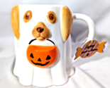 This unique coffee mug features a spooky and cute ghost dog design with a jack-o'-lantern pumpkin treat bag.