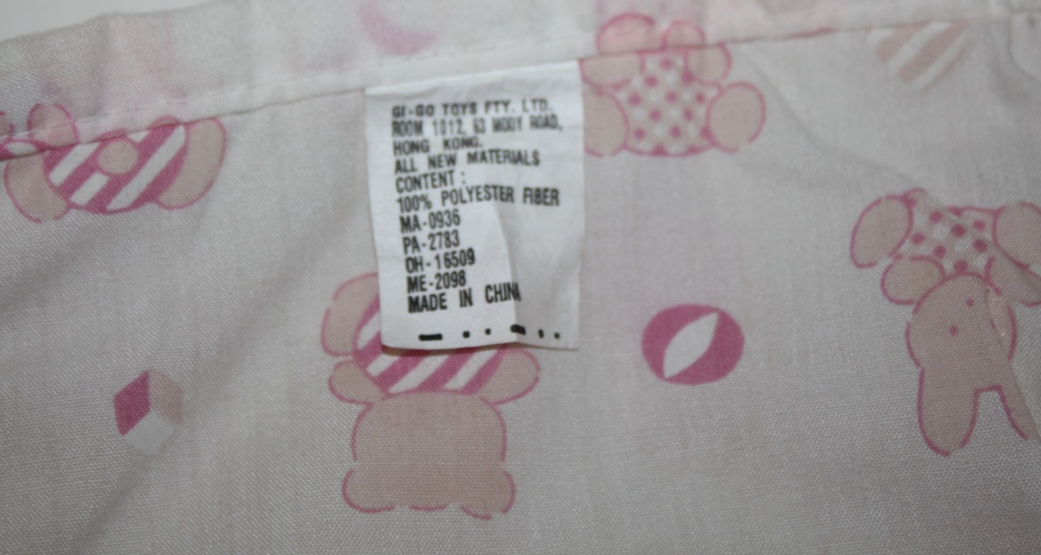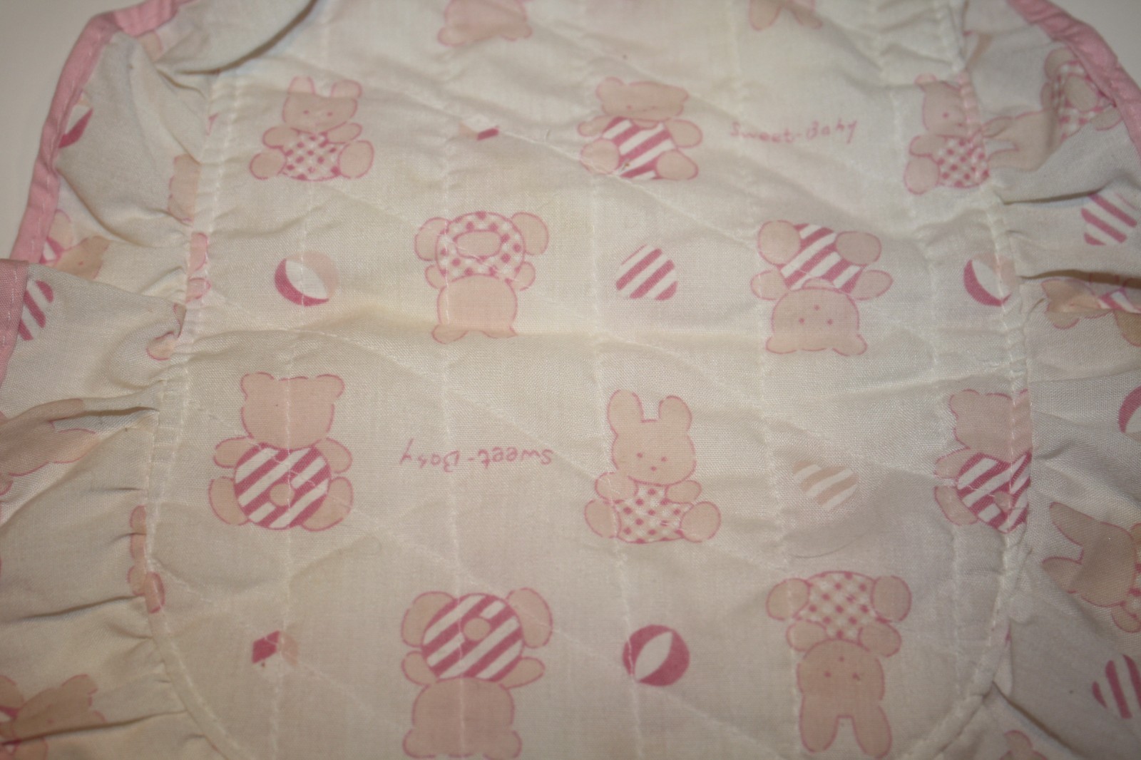 Condition: Replacement doll bedding material, "Sweet Baby", Bunny, Bear, Ball, Heart printed, Ruffle edge on 3 sides. Approx 10" L x 8.5" W. Has a little discolor on edge of ruffle. Smoke-free environment.