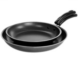 The Gibson Everyday Highberry 2 piece frying pan set comes with a 12in and 10in frying pan. Each pan features a nonstick coating for easy food release, low fat cooking options, and fast clean up. Cool touch handles let you move pans from burner to burner safely while cooking. Lightweight construction with ergonomic handle grip.