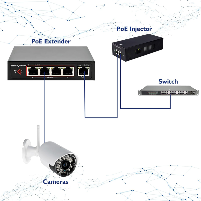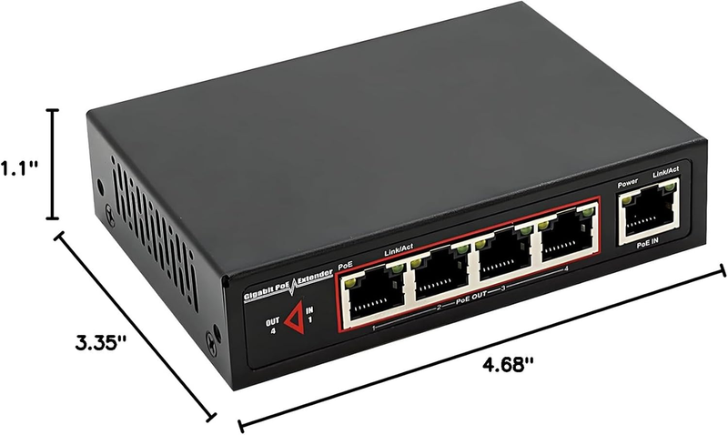 4 Channel gigabit PoE extender, easy to extend PoE Power to Four PoE devices, such as Wireless APs, Base Stations, Network Cameras or other PoE devices through an exterior network data cable.