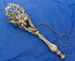 Gilt metal tussie mussie with an ornate cast floral cup. The cup has large leaves and exotic flowers. The cup was made in two parts, and there is a split in the seam where the two parts meet at the base of the cup. It measures 5 3/4" long and 1 3/4" diameter of the cup. It has the original chain with ring attached. There is plating loss to the handle. Amazing piece!