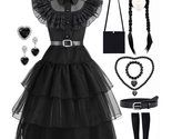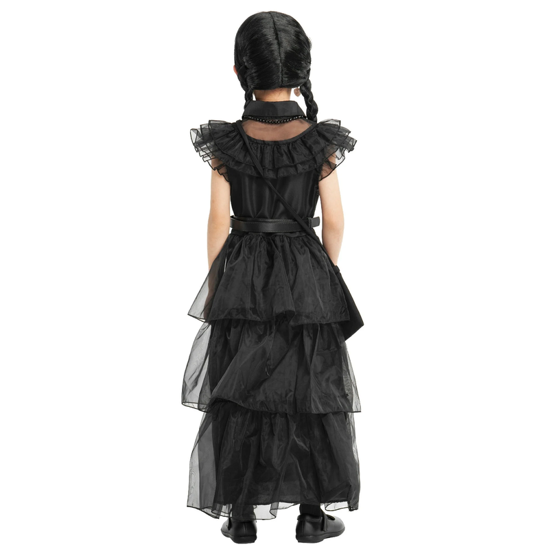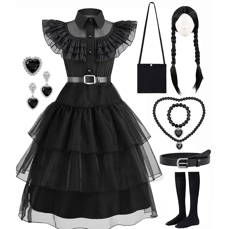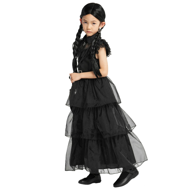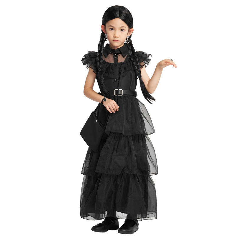 Item Includes: Long black dress, belt, Wig, necklace, bracelet, earrings, Socks, purse Design Concept: Originating from the classic character design of the popular television drama, it belongs to the girls' black themed dress More Details: Pointed collar; Hidden zip on the right side of the waist for easy on/off; Pleated hems and tiered skirts on both front and back Ideal Gift: It's a great gift for little girls who love drama characters, perfect for Halloween, holidays, themed events, birthdays, parties and more! We do our best to offer our customers high quality product and best service, any questions about the product, please contact us immediately, we will give you a satisfied solution