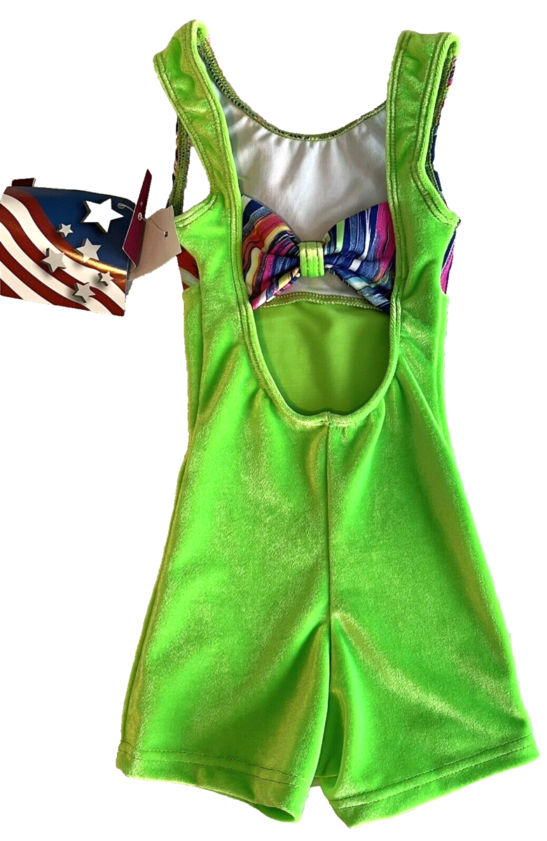 - Girls Motionwear Velour Biketard Green w/ Striped Contrast Size XS (3-4) New
