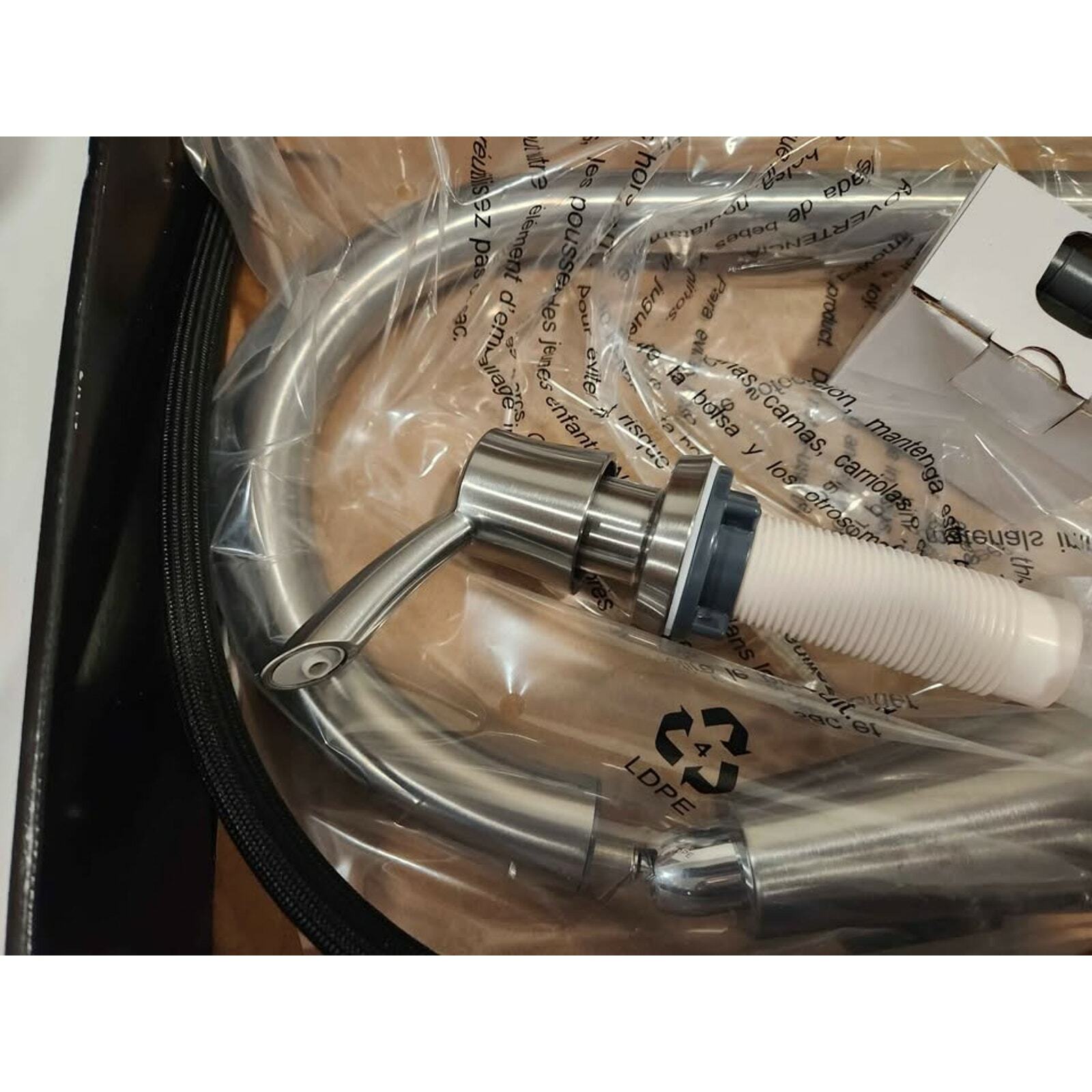 New open box Glacier Bay Sadira double-handle pulldown kitchen faucet with soap dispenser. Never installed. All parts included in original packaging: faucet body with pull-down sprayer, soap dispenser, mounting hardware, quick-connect supply lines, and manual.