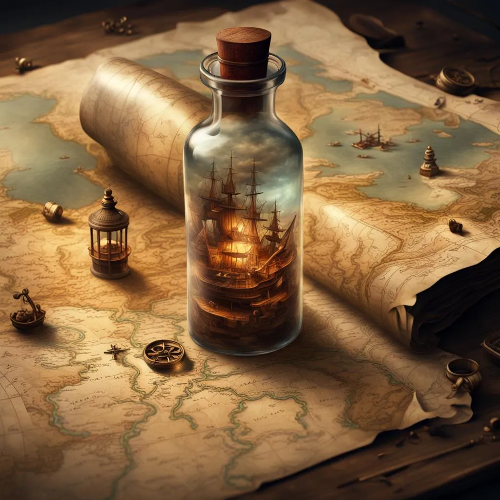 Treasure Map in Glass Bottle: A meticulously designed miniature treasure map, carefully rolled and tucked inside a clear glass bottle enclosed with a cork.