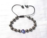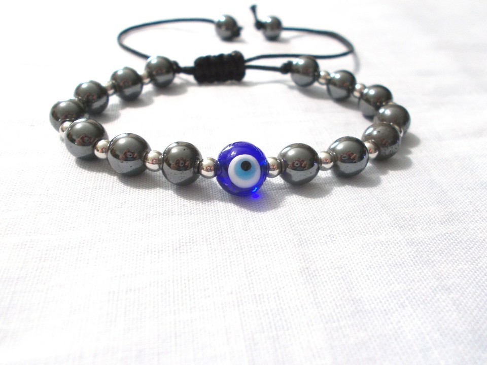- GLASS COBALT BLUE LUCKY EYE EVIL EYE ON HEMATITE with STEEL SPACER ADJ BRACELET