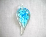 Solid CLEAR GLASS DROPLET / DROP pendant with A BABY BLUE WHITE FLORAL FLOWER BURST DESIGN IN THE CENTER.