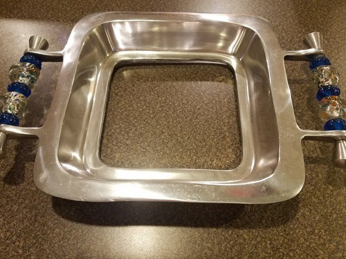 - Glass ~Square Dish in Silver Metal Holder ~ Beaded Handle Design ~ 8.5" x 8.5"