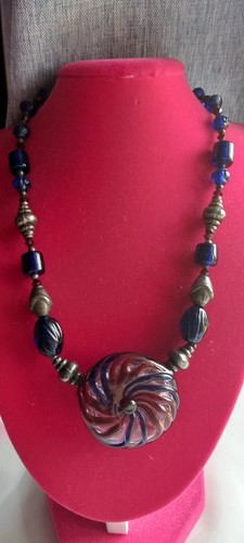 - Glass lampwork bead & black stone necklace 13-15"+ strung on fine wire unmarked