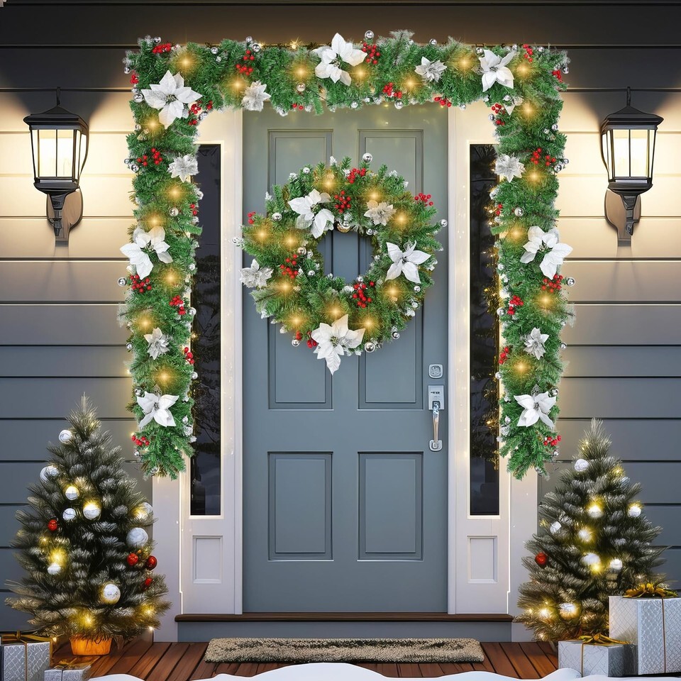 Outdoor and Indoor Christmas Decorations: the outdoor indoor Xmas garland with lights is handcrafted from quality artificial pine branches and mixed ornaments, and the ornaments on the wreath will not fall off or fade; The classic color scheme creates a joyful and festive atmosphere, making it an ideal Christmas decoration for your room or outdoors