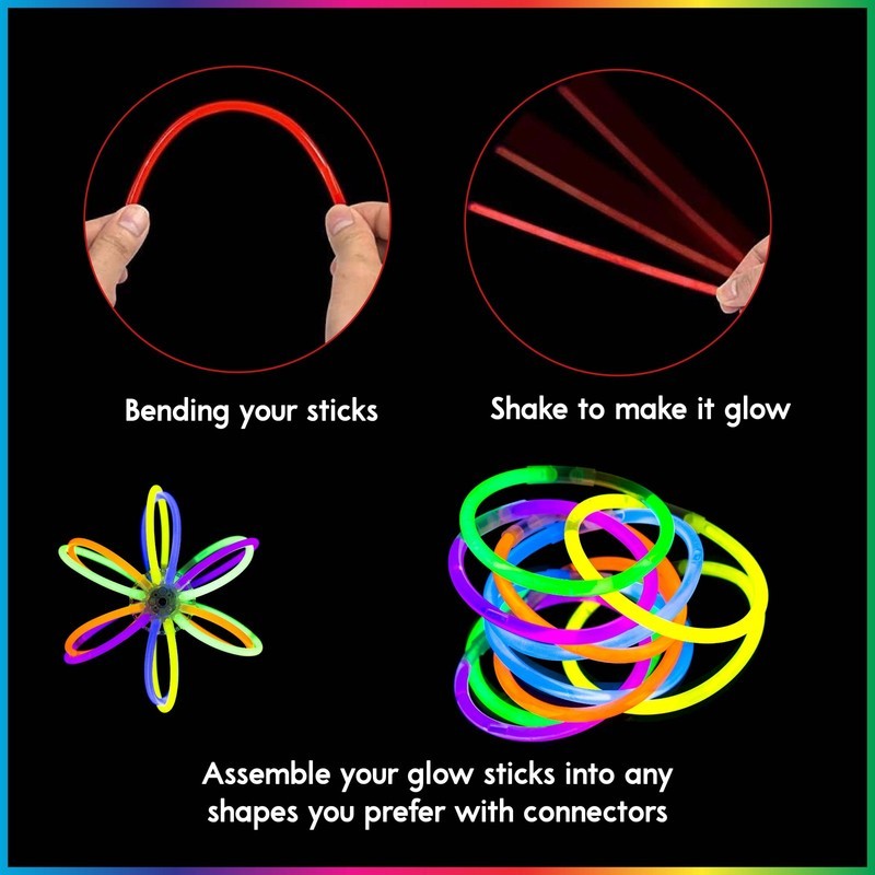 Includes 100 pieces of super bright light sticks and 100 dependable connectors Each 8-inch glow stick glows brightly for 10-14 hours Designed for safety with a sturdy construction to prevent leaks Ideal for creating chic bracelets and cool necklaces for any occasion Perfect for pool parties, birthdays, carnivals, raves, concerts, weddings, and camping