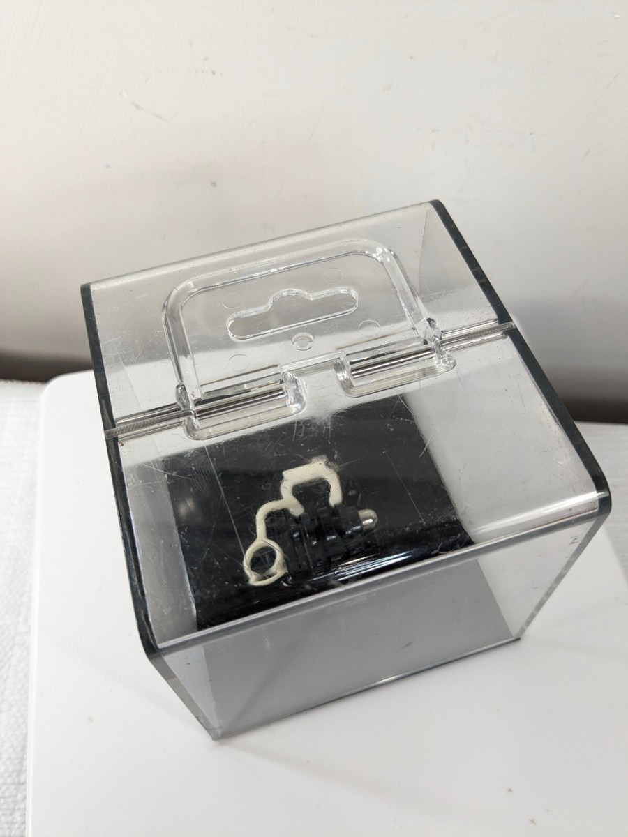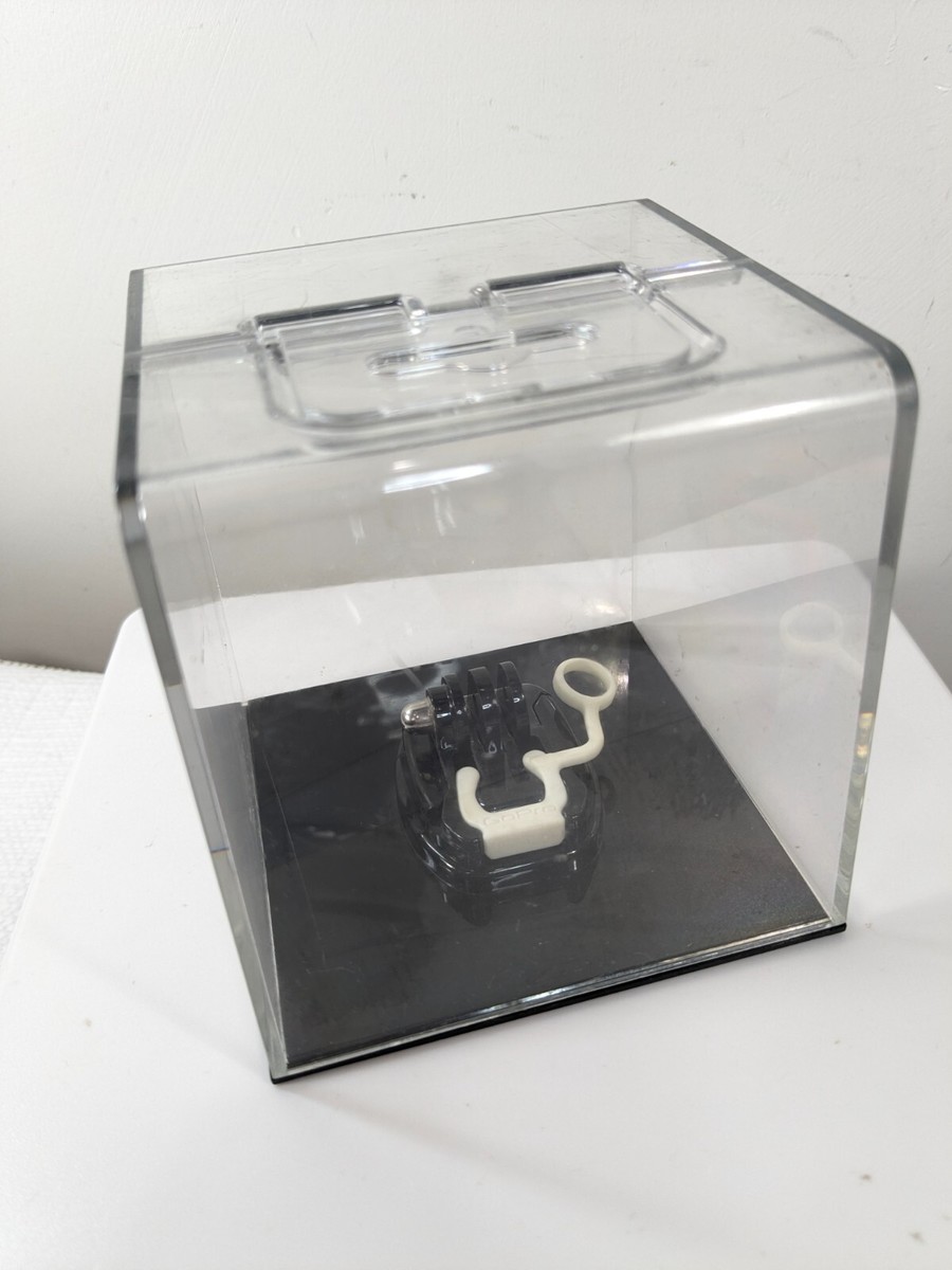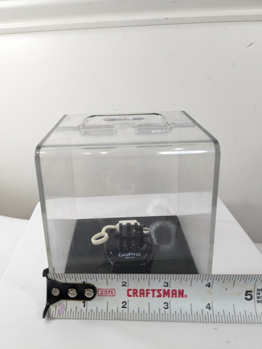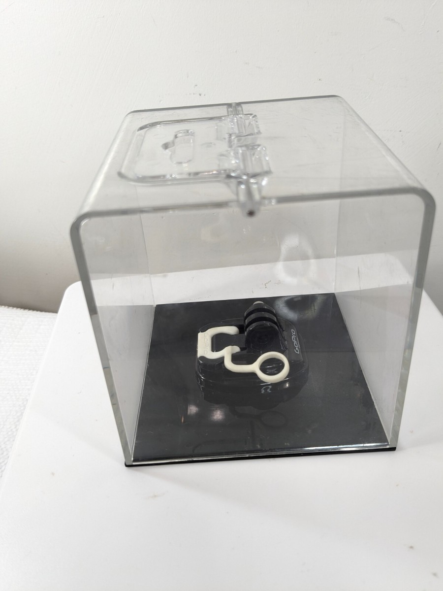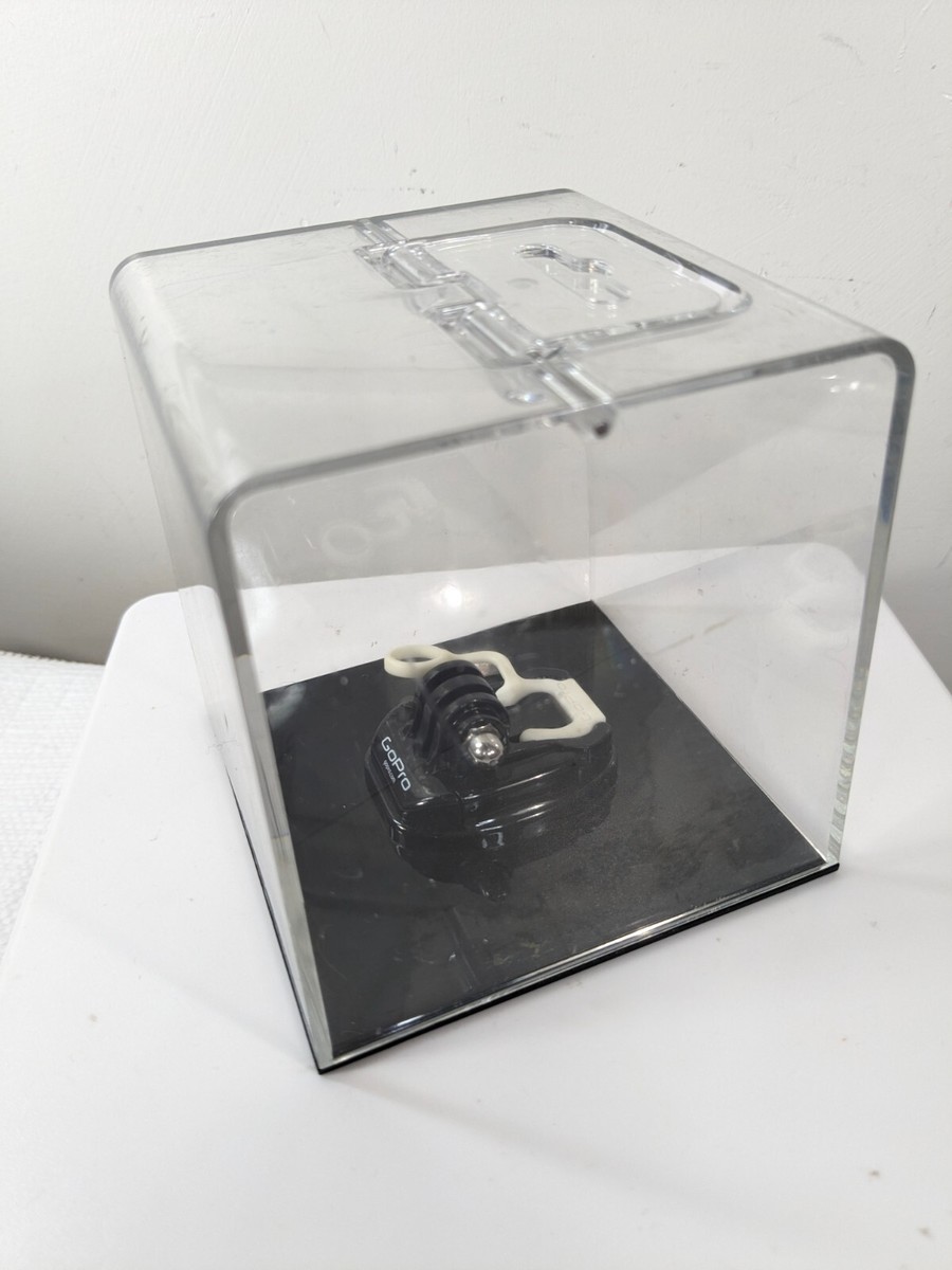 Clear container that the Go Pro camera came in. ONLY INCLUDES PARTS SHOWN. Clear acrylic with black base. Some scratches/marks/wear as shown. See all pics.