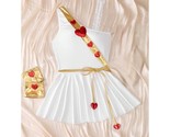 This stunning white one-shoulder mini dress features a metallic gold sash wrapped diagonally across the chest, detailed with vibrant red hearts that pop against the soft fabric. The pleated skirt adds a flirty touch, while the gold waist tie accentuates your shape.