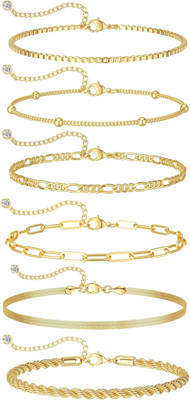 ? ?6Pcs GOLD BRACELETS SET?:Set contains: ?Satellite Bracelets ?Figaro Bracelets ?Box Chain Bracelets ?Paperclip Bracelets ?Satellite Bracelets ?Rope Bracelets. These Bracelets are suitable for layering as well as being worn alone.