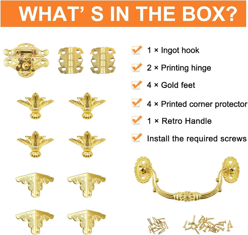 ?Package Includes?1 zinc alloy buckle, 2 printed mini hinges, 4 gold zinc alloy feet, 4 gold 25MM printed wooden box corners, 1 gold round bead handle. Two size of screws in sufficient quantities to mount these accessories, please select the appropriate screw installation according to the diameter of the screw holes on the accessories.