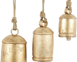 Create a sense of balance and depth in the most unique way by hanging these bells in empty spaces needing some extra love. Bell decor set is stunning year round, but provides the added benefit of transitioning to holiday decor when the season is near. Add charming appeal to your home by hanging this gold set of 3 meditation bell in a doorway or hallway corner, or kitchen for added visual flair. This item ships in 1 carton. Metal decorative cow bells makes a great gift for any occasion. Can be hung vertically using the jute rope; nails and screws not included. Suitable for indoor use only. This item ships fully assembled in one piece. Made in India. This gold colored metal meditation bell comes as a set of 3. Rustic style.