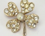 - Gold Tone 4 Leaf Clover w/Clear Rhinestones Brooch Pin Faux Pearl .86" x .86"
