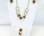 Gold Tone Chain Necklace With Faux Ruby Bracelet + Clip Earrings Estate Jewelry