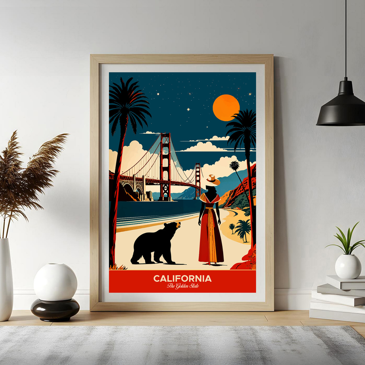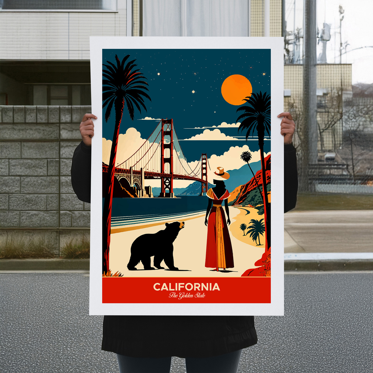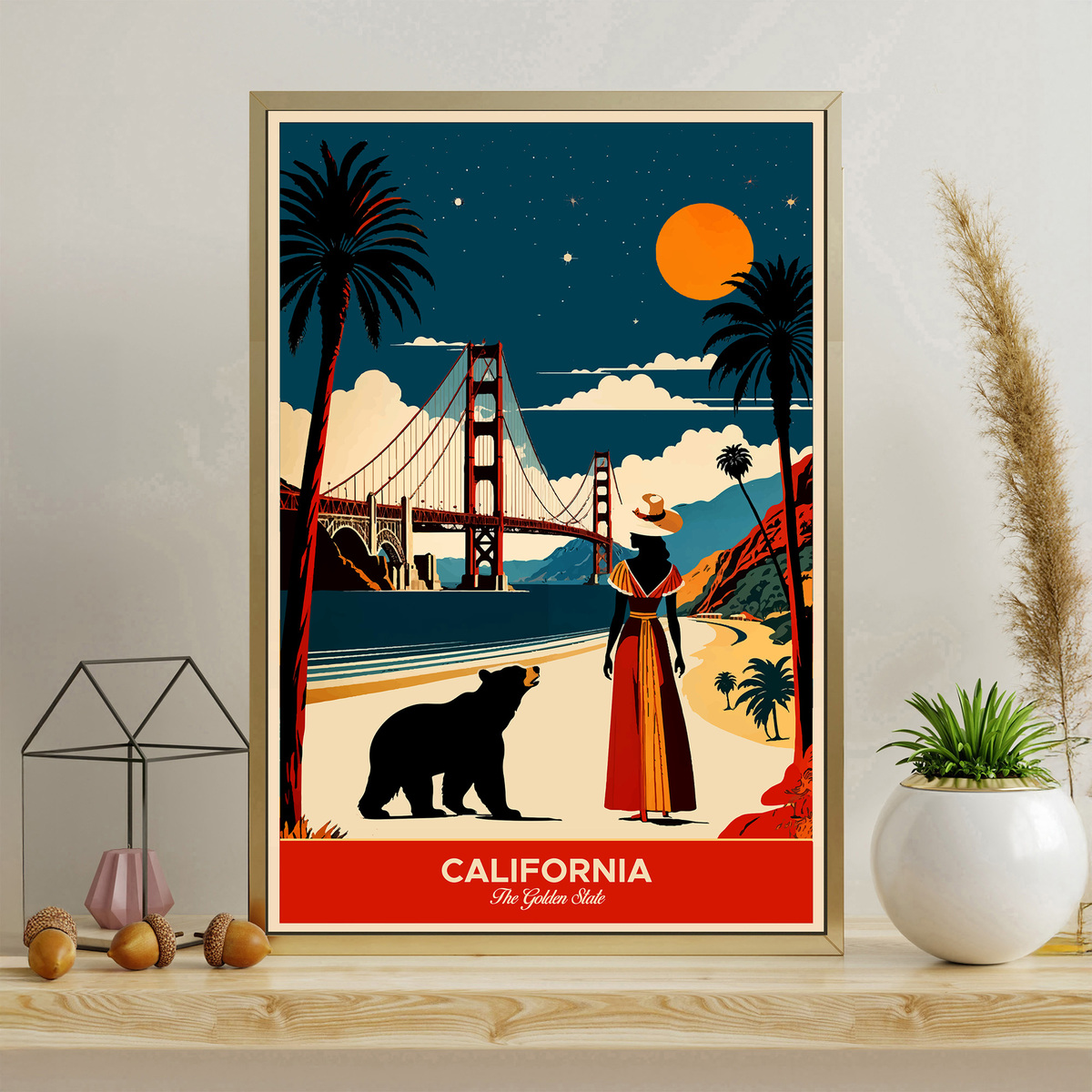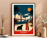 Experience the allure of "California: The Golden State" travel poster! In this vibrant artwork, a woman in a hat gazes at the Golden Gate Bridge from a picturesque beach, accompanied by a bear. The scene beautifully captures California’s iconic landmarks and natural beauty, with a stylized, colorful sky that evokes the state’s enchanting atmosphere. Perfect for anyone who loves the charm and adventure of California, this piece invites you to immerse yourself in its stunning landscapes and spirit!