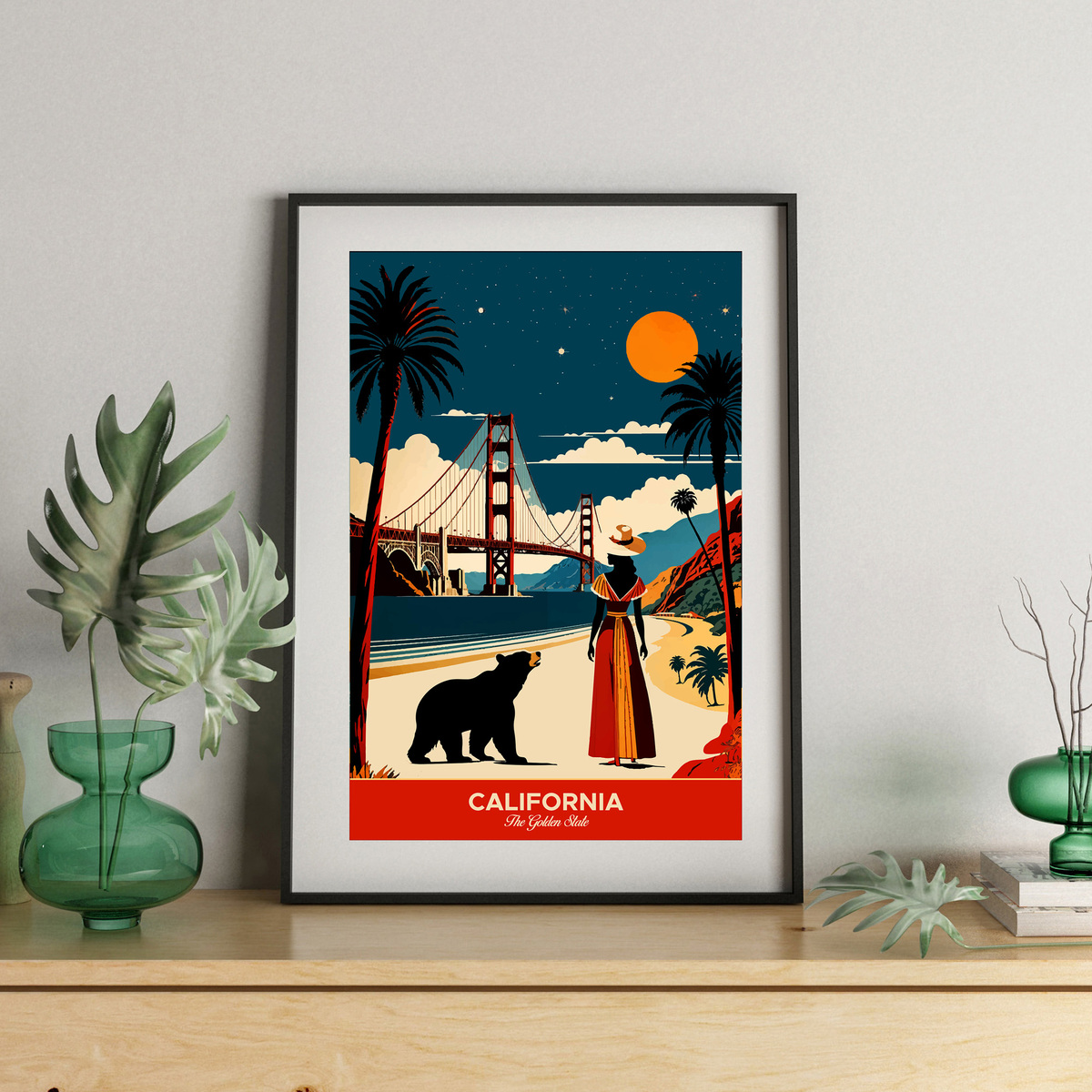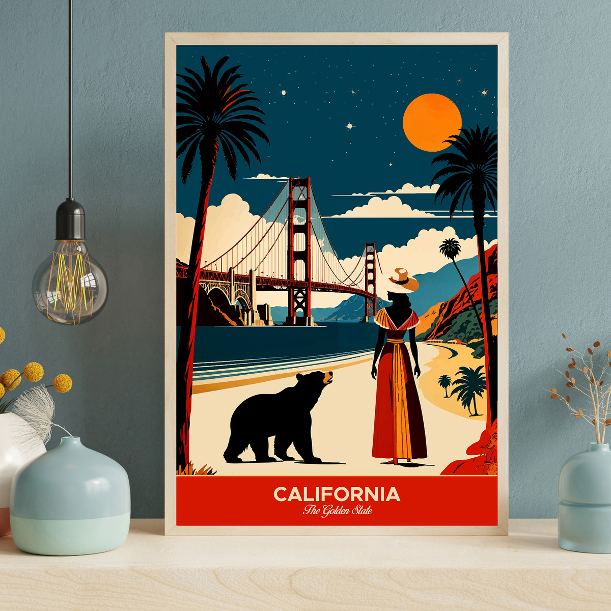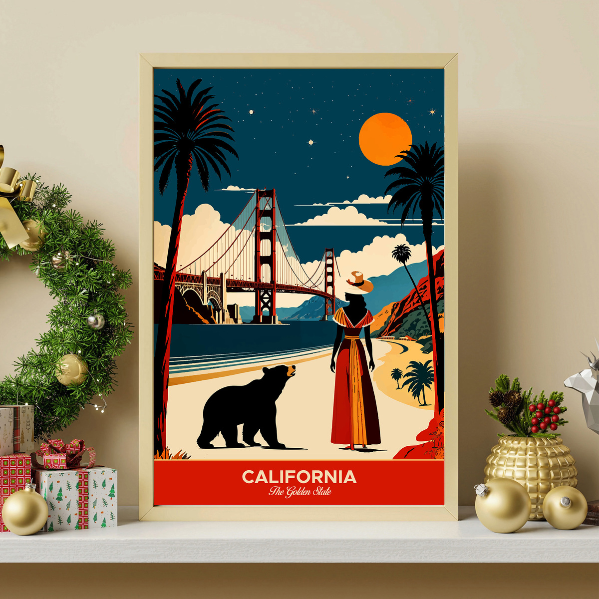 Experience the allure of "California: The Golden State" travel poster! In this vibrant artwork, a woman in a hat gazes at the Golden Gate Bridge from a picturesque beach, accompanied by a bear. The scene beautifully captures California’s iconic landmarks and natural beauty, with a stylized, colorful sky that evokes the state’s enchanting atmosphere. Perfect for anyone who loves the charm and adventure of California, this piece invites you to immerse yourself in its stunning landscapes and spirit!