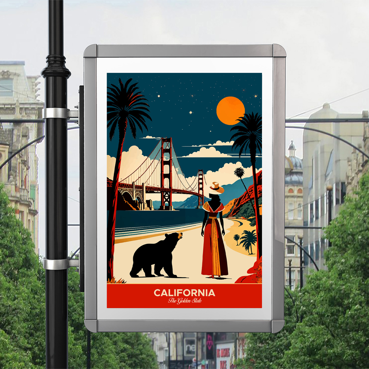 This *California “Golden State”* poster celebrates the beauty of San Francisco’s Golden Gate Bridge in a striking retro art deco style. With vivid colors, clean silhouettes, and timeless design, it’s perfect for vintage travel art lovers and California dreamers alike.